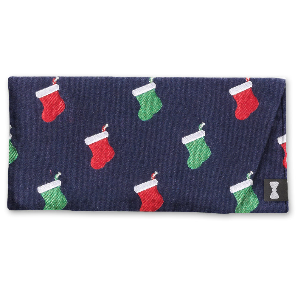 Navy blue woven silk hosts a repeating pattern of red and green holiday stockings - each one trimmed with white and hanging on a silver peg - just waiting for the jolly old elf's visitation.