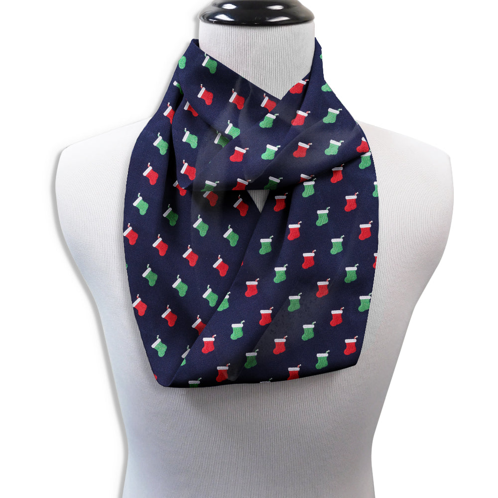 Navy blue woven silk hosts a repeating pattern of red and green holiday stockings - each one trimmed with white and hanging on a silver peg - just waiting for the jolly old elf's visitation.