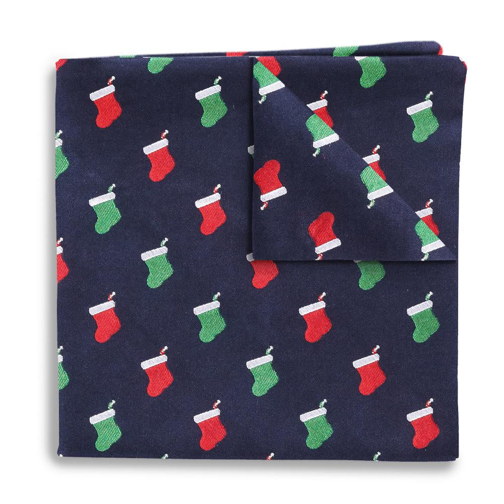 Navy blue woven silk hosts a repeating pattern of red and green holiday stockings - each one trimmed with white and hanging on a silver peg - just waiting for the jolly old elf's visitation.