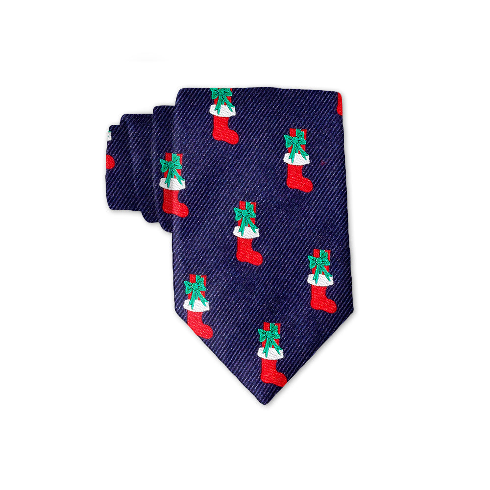 You may be a few bricks shy of a chimney, but you can get into the spirit of Christmas stockings with this charming design featuring beribboned gifts in red socksall woven in navy blue British silk.