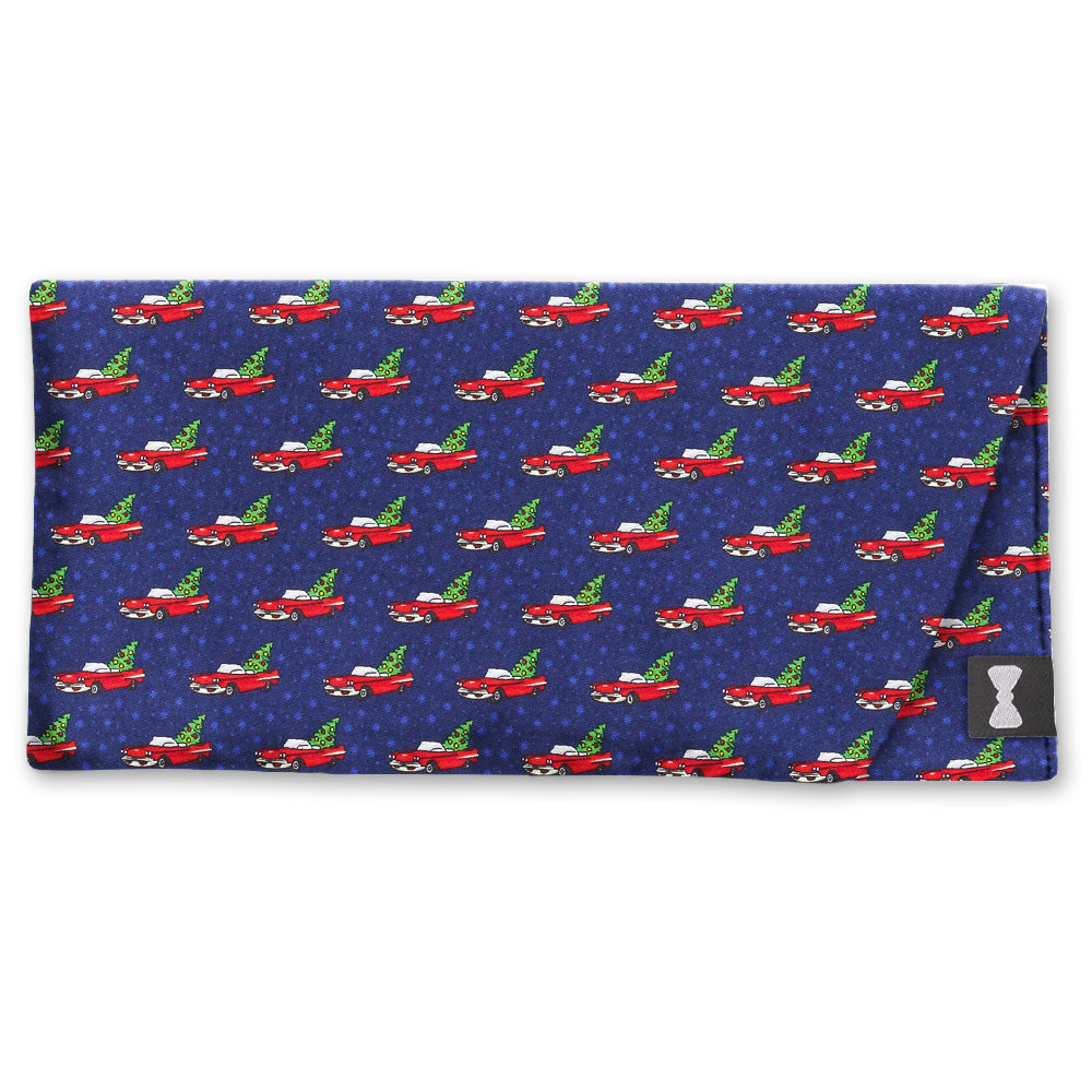 Hints of snow are falling as shiny red convertibles ferry fully decorated trees home for the holidays on this delightful design on dark blue printed silk.