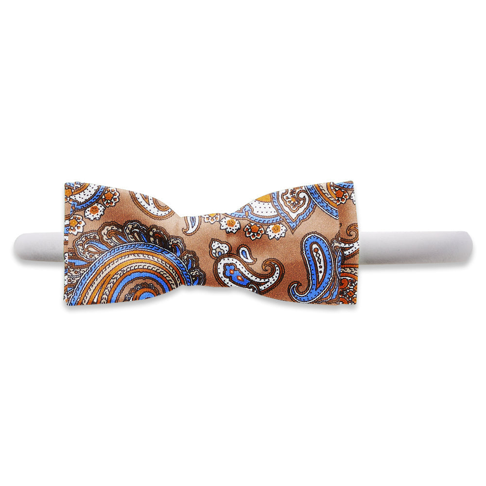 Add some flair to your wardrobe with this lovely blue and brown paisley pattern on a delicious shade of warm latte Italian silk twill.