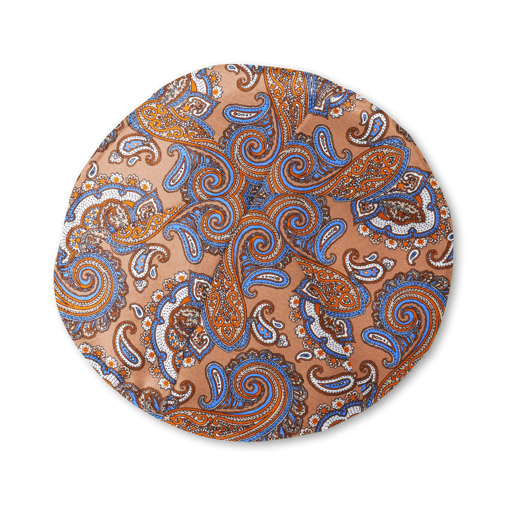 Add some flair to your wardrobe with this lovely blue and brown paisley pattern on a delicious shade of warm latte Italian silk twill.