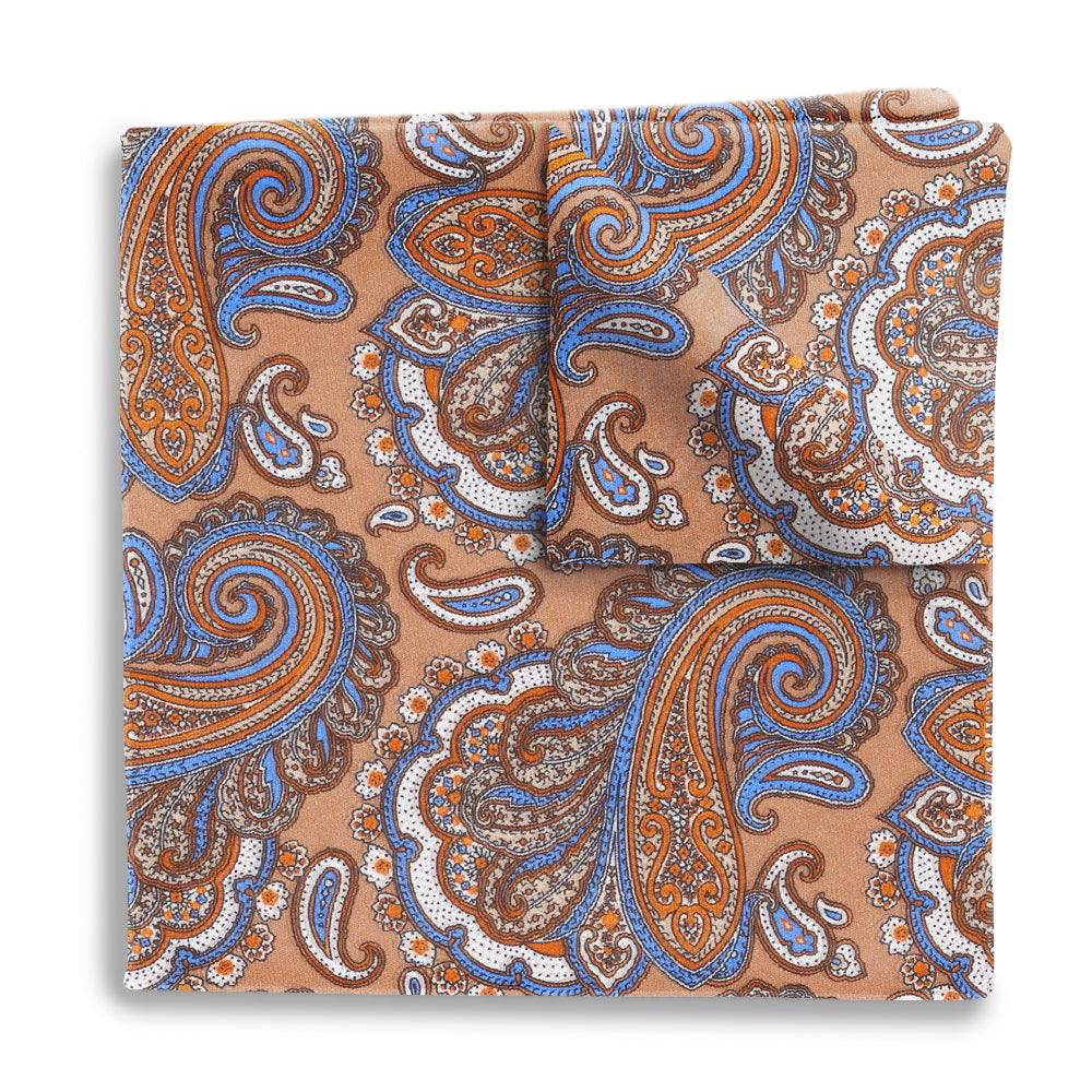 Add some flair to your wardrobe with this lovely blue and brown paisley pattern on a delicious shade of warm latte Italian silk twill.