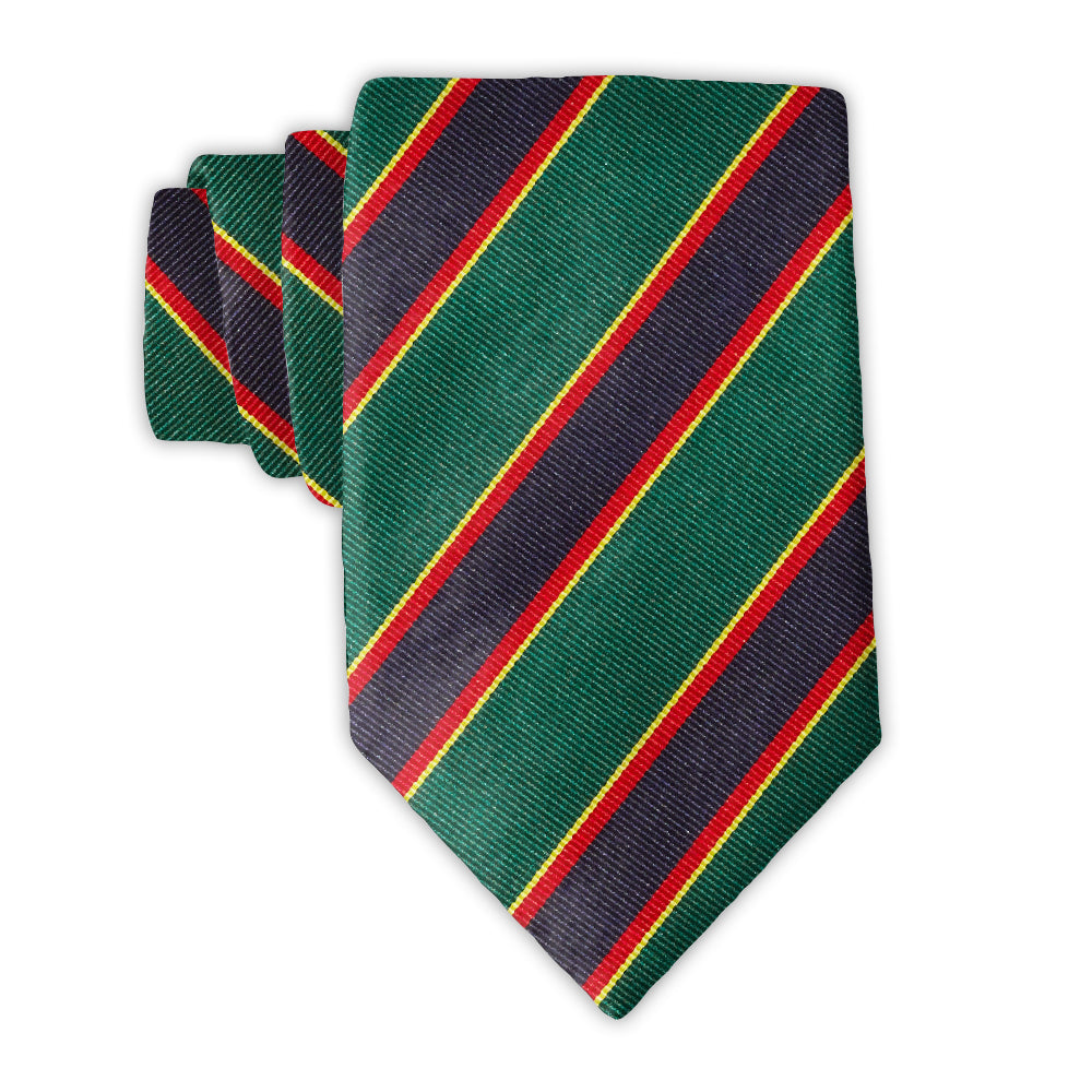 Broad swaths of forest green woven silk in a classic ribbed texture, are flanked by quintets of yellow, red and navy blue in this never-out-of- style stripe.