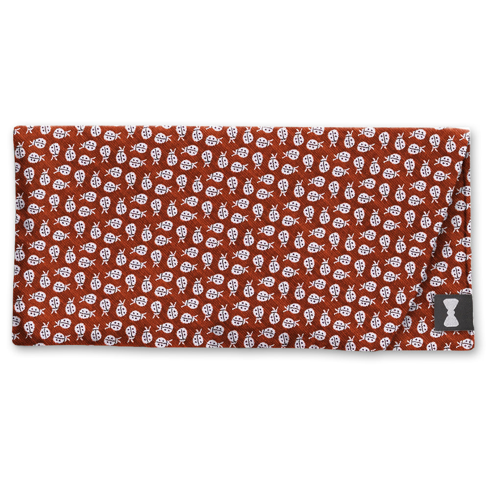Dark red woven silk hosts a loveliness of ladybugs - maybe getting ready to fly away home?