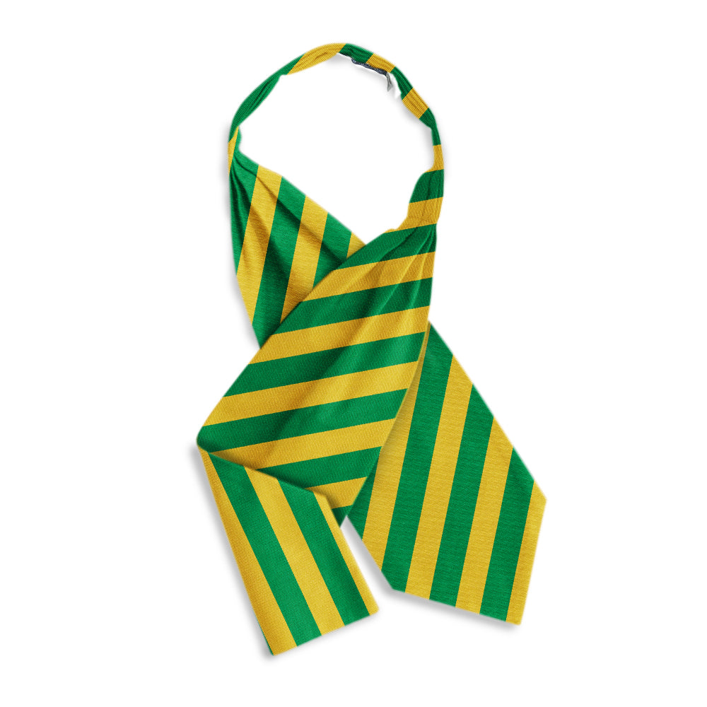 The Collegiate Green and Gold patterned free-fold cravat features three stitched center pleats that allow luxurious drape in front without fabric bulk at the nape of your neck. It is completely reversible and sized for a perfect fit. May require a stick-pin.