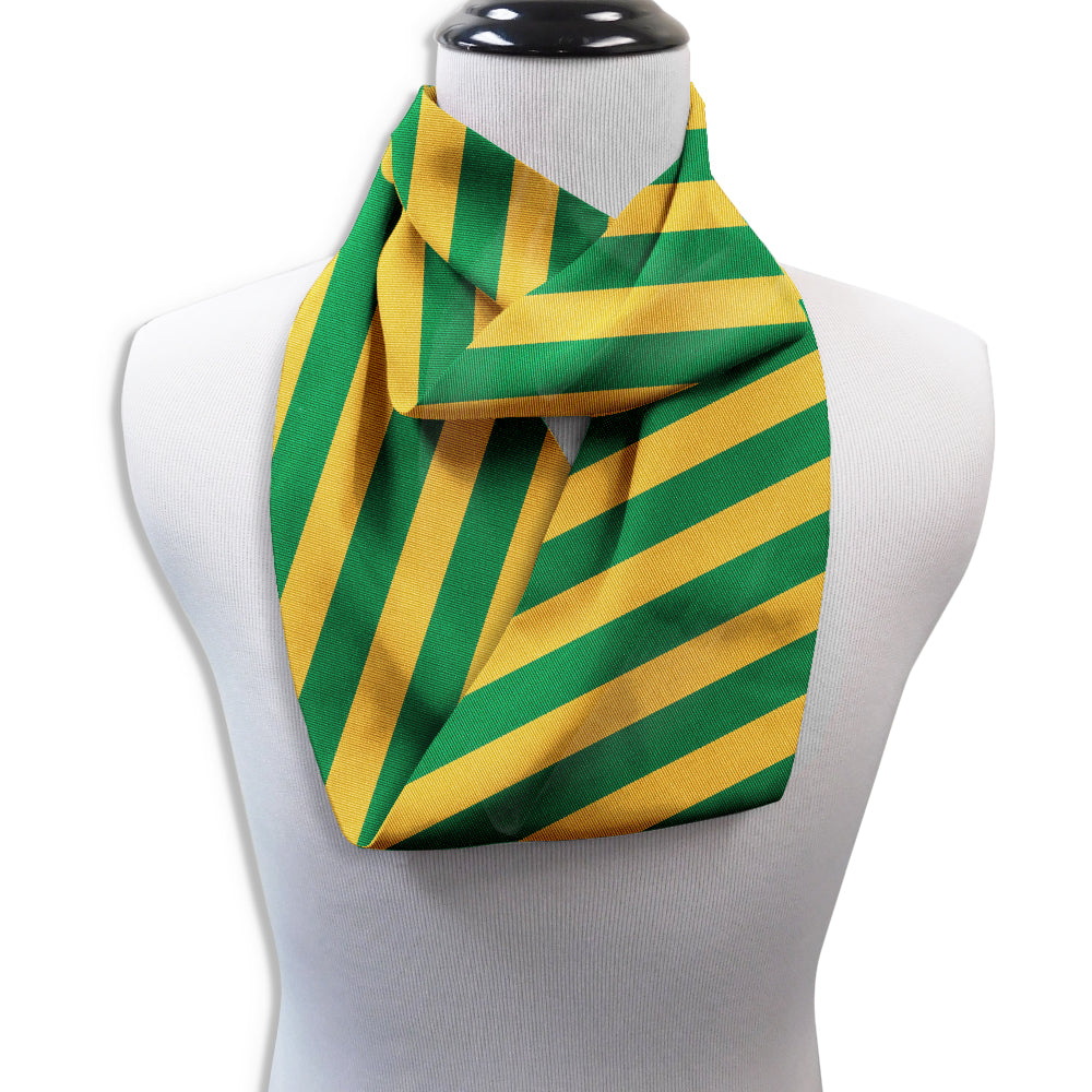 Each scarf is double-sided with a 58 inch circumference and is 6 inches wide. If you've always wanted a silk scarf, the Collegiate Green and Gold is a great choice!