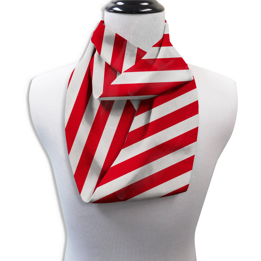 Each scarf is double-sided with a 58 inch circumference and is 6 inches wide. If you've always wanted a silk scarf, the Collegiate Red and Silver is a great choice!