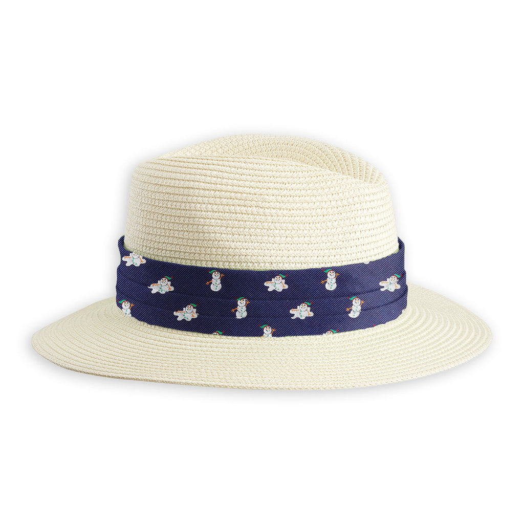 These cool snowmen got a little too cool for their own goodand then had a meltdown. The smiles remain, however, on these green-capped, carrot-nosed guys woven in navy blue silk.