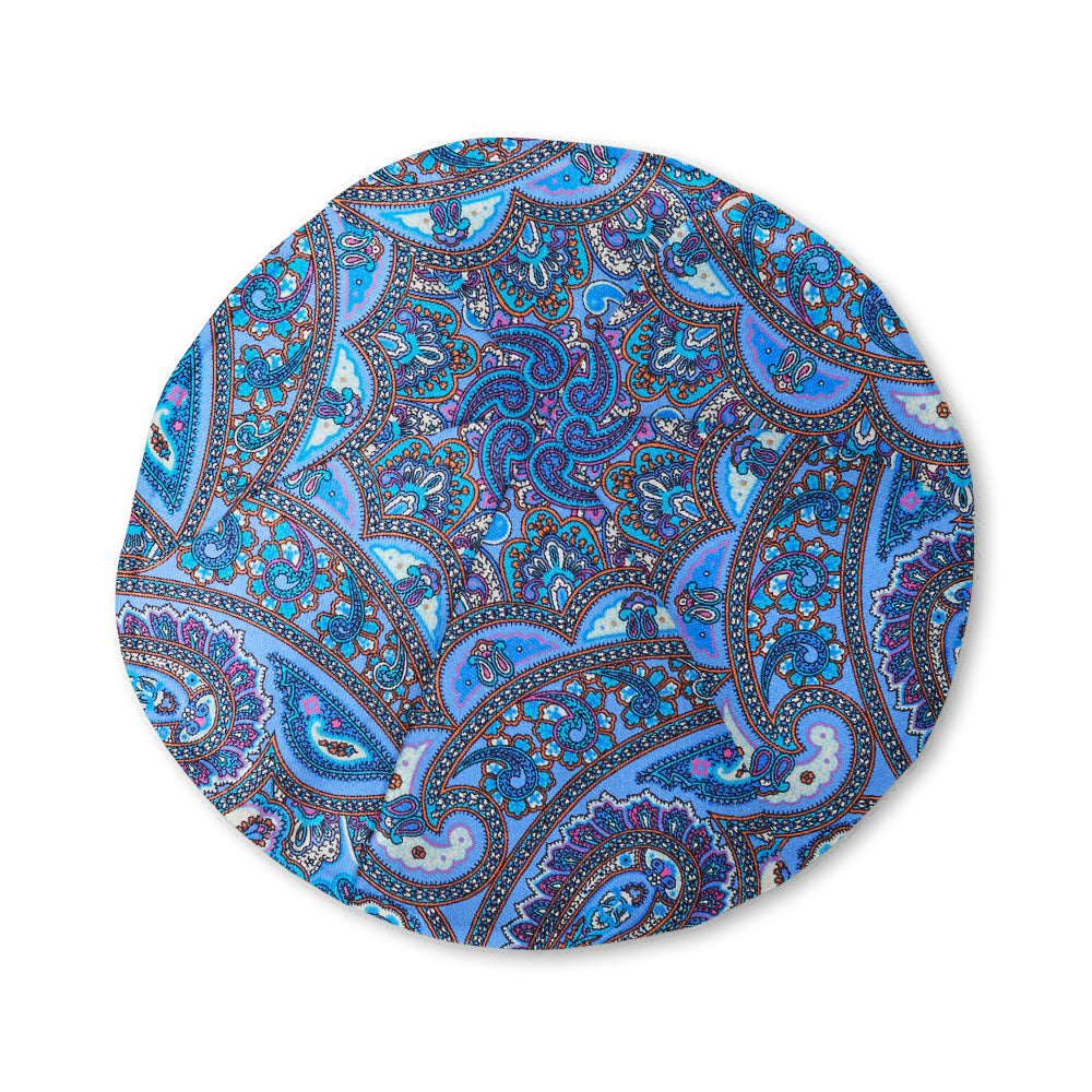 A beautiful shade of light blue Italian silk twill hosts whirls and swirls of paisley and floral iconography in shades of blue, pink, white and gold.