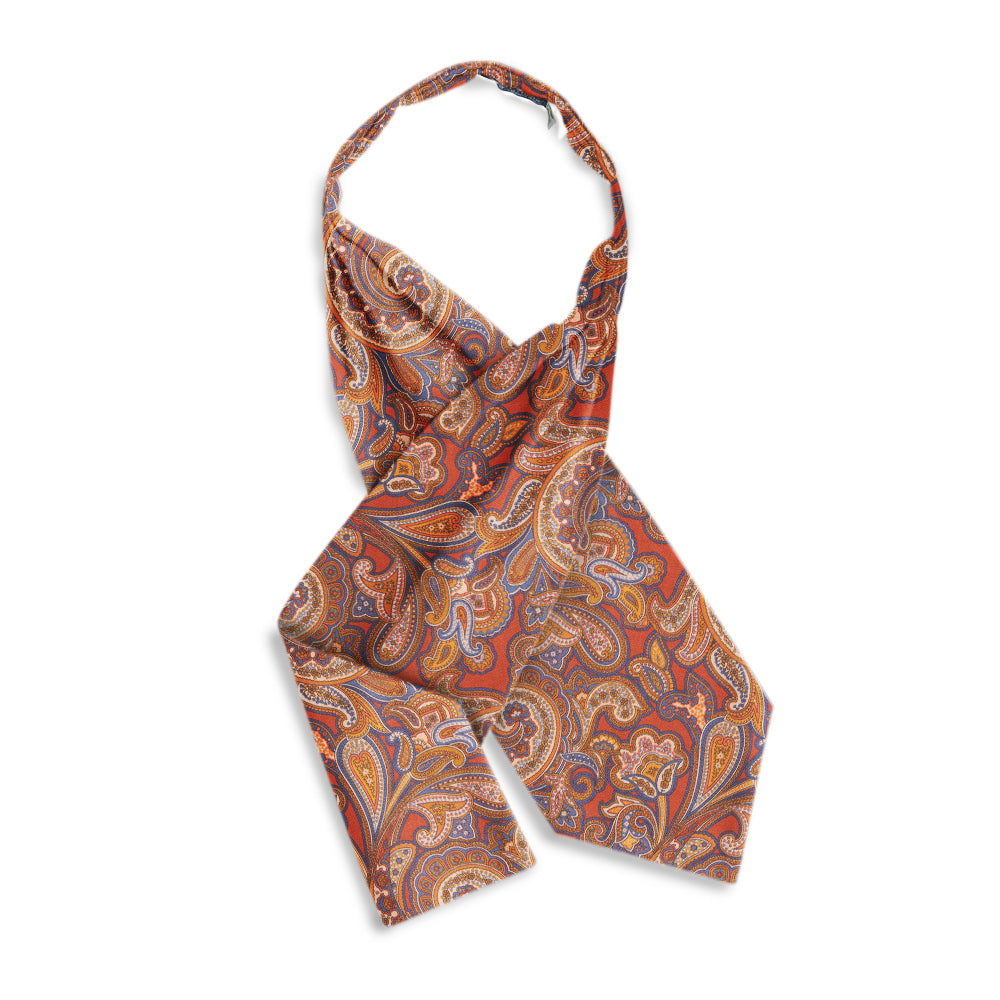 Paisleys in autumnal shades of copper, blue and tan swirl together on this silky smooth Italian silk. A show-stopping choice!