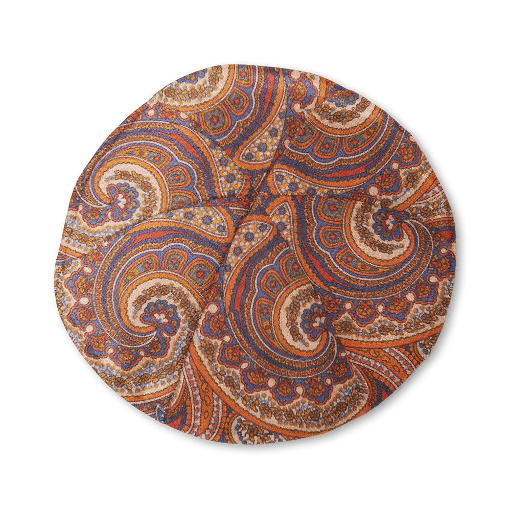 Paisleys in autumnal shades of copper, blue and tan swirl together on this silky smooth Italian silk. A show-stopping choice!