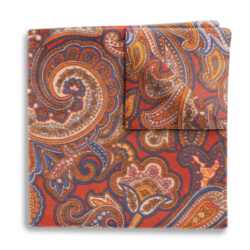Paisleys in autumnal shades of copper, blue and tan swirl together on this silky smooth Italian silk. A show-stopping choice!