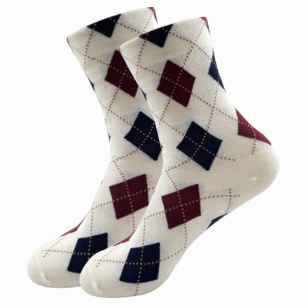 How can you resist these creamy white argyle pattern socks with their navy blue and wine red diamonds?