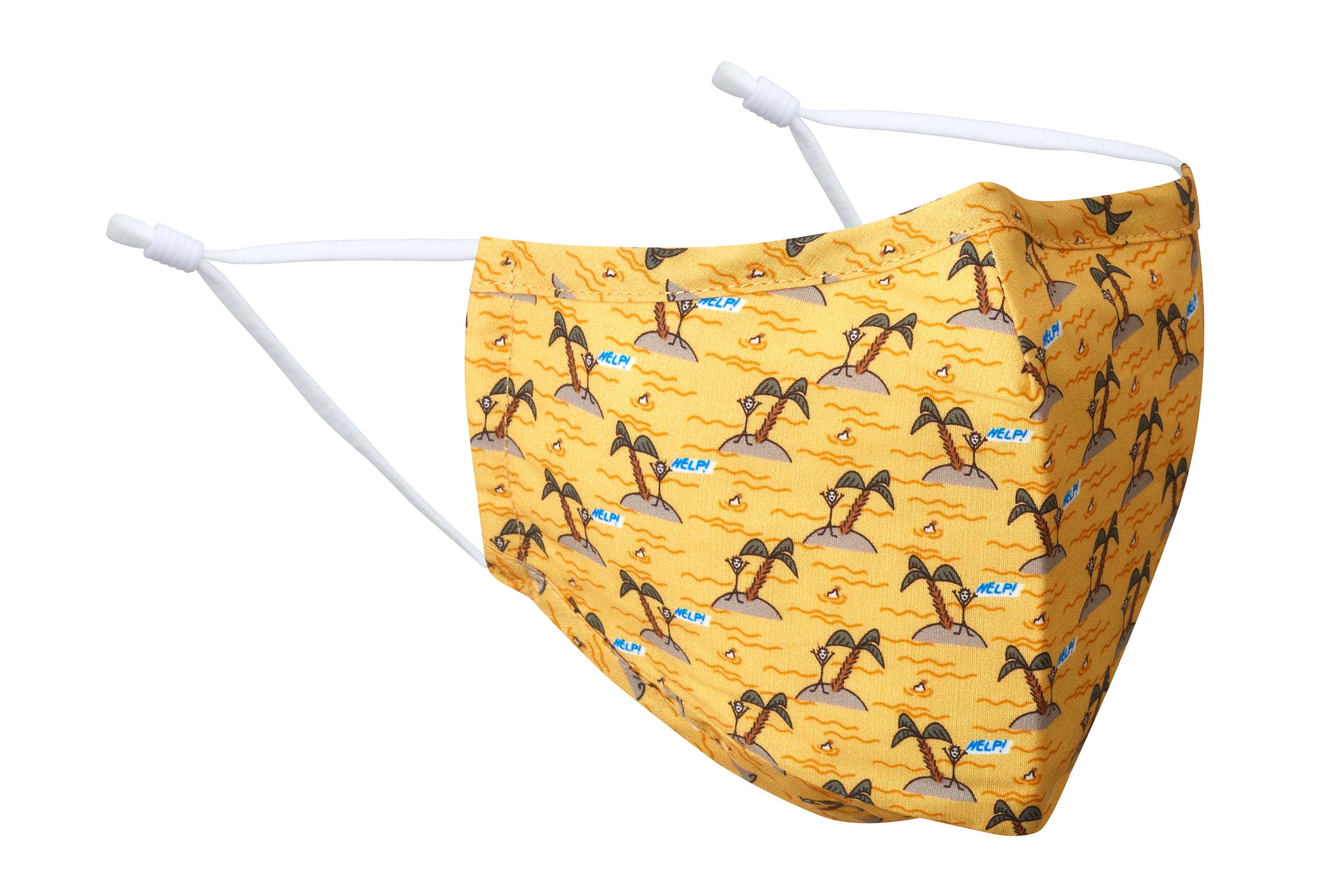 When you need to be just a bit silly, don this yellow cotton face mask and its plethora of cast-aways on single-palmed isles, some calling for help - others not.