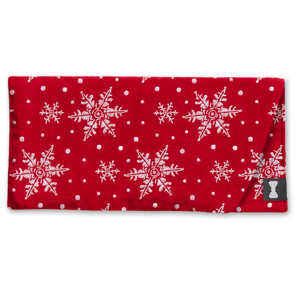 The tips of each large snow crystal, and the centers of the smaller ones, actually sparkle - the result of silver thread woven in the bright red silk. A beautiful choice for holiday wear as well as long into the winter.