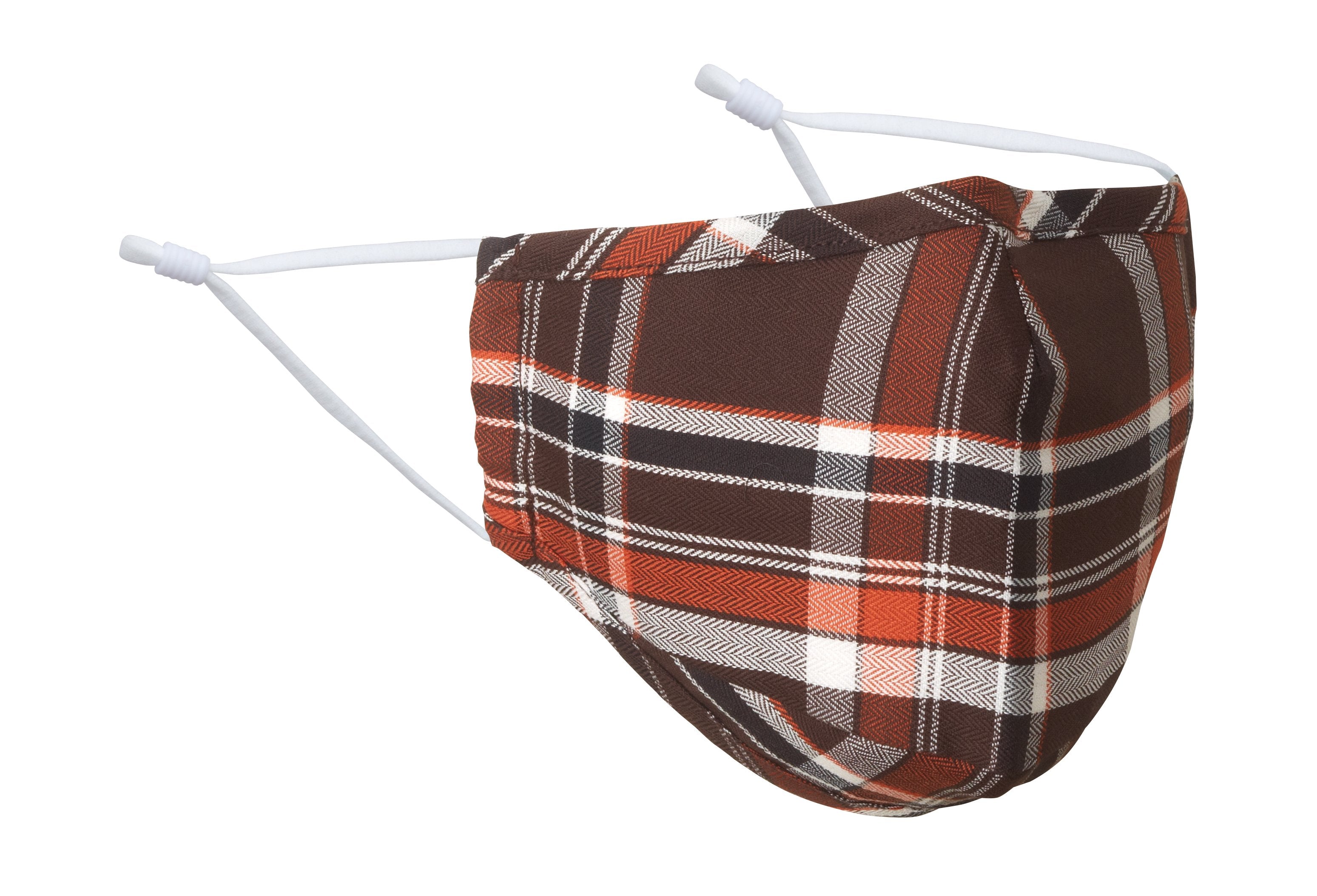 Cover up and look good in this oh-so-comfortable face mask with its warm brown, white and copper plaid pattern.