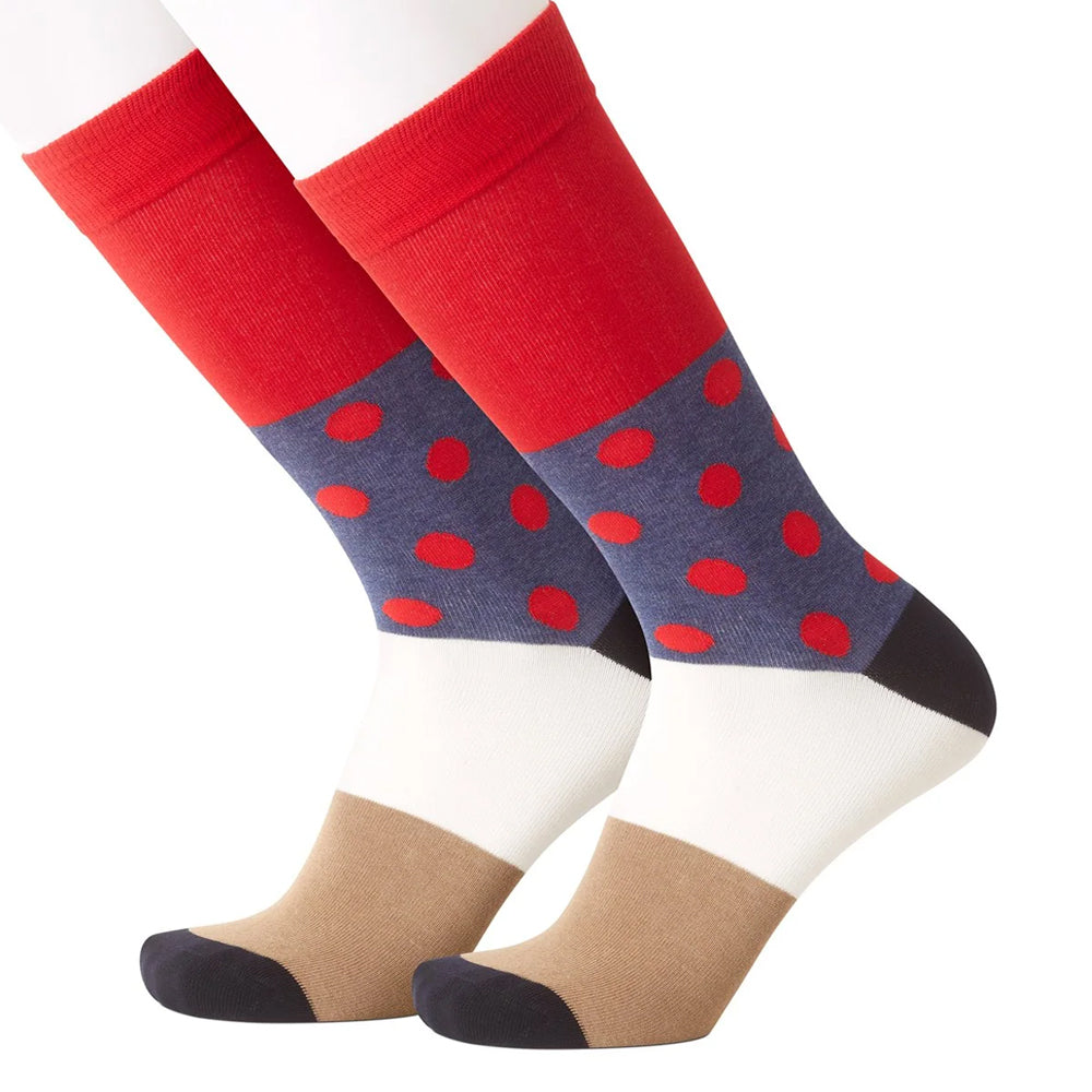 Solid bands of burgundy, white and taupe are interrupted by burgundy dots on navy blue. Black heels and toes. Surprisingly fun!