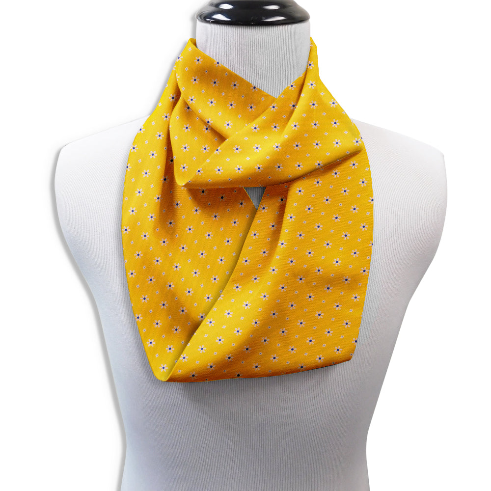 Each scarf is double-sided with a 58 inch circumference, and each is 6 inches wide. If you've always wanted a great scarf, the Daisy Springs Yellow is a great choice!