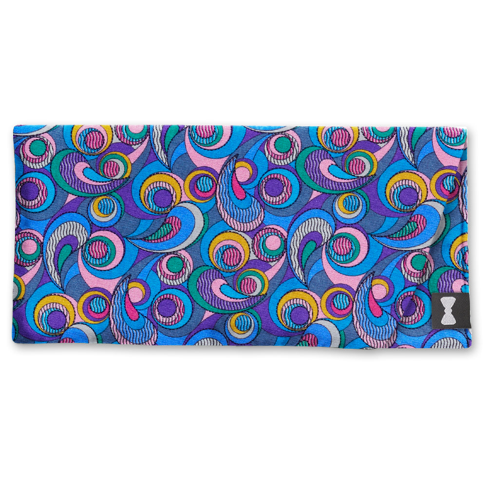 Whirls and swirls of blue, yellow, pink, teal and purple in all manner of combinations create the esssense of carefree happiness on this blue Italian silk twill.