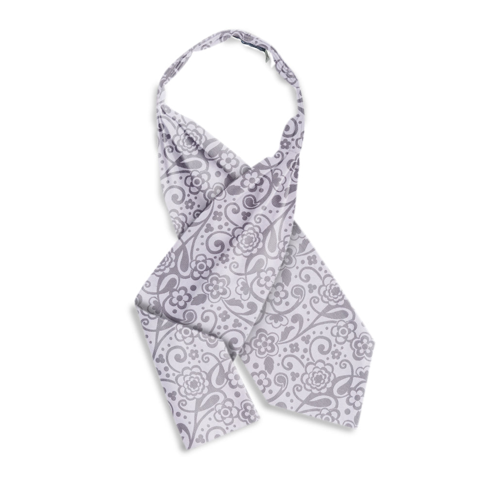 You'll stand out from the crowd wearing these gala floral icons of warm grey woven in silvery white silk. A great choice for any special occasion.