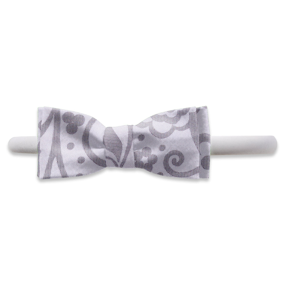 You'll stand out from the crowd wearing these gala floral icons of warm grey woven in silvery white silk. A great choice for any special occasion.