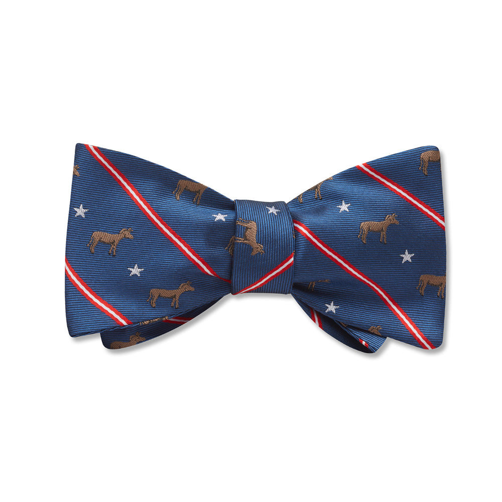 Broad bands of navy blue woven silk, each bordered with a slender trio of red and white stripes, host a repeating pattern of white stars and brown donkeys.