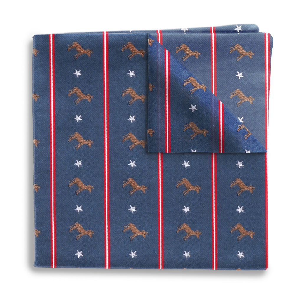 Broad bands of navy blue woven silk, each bordered with a slender trio of red and white stripes, host a repeating pattern of white stars and brown donkeys.