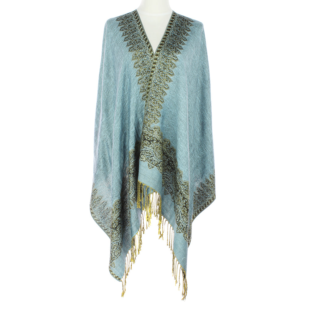 This silky soft denim blue pashmina scarf features a beautifully woven border of gold and black.