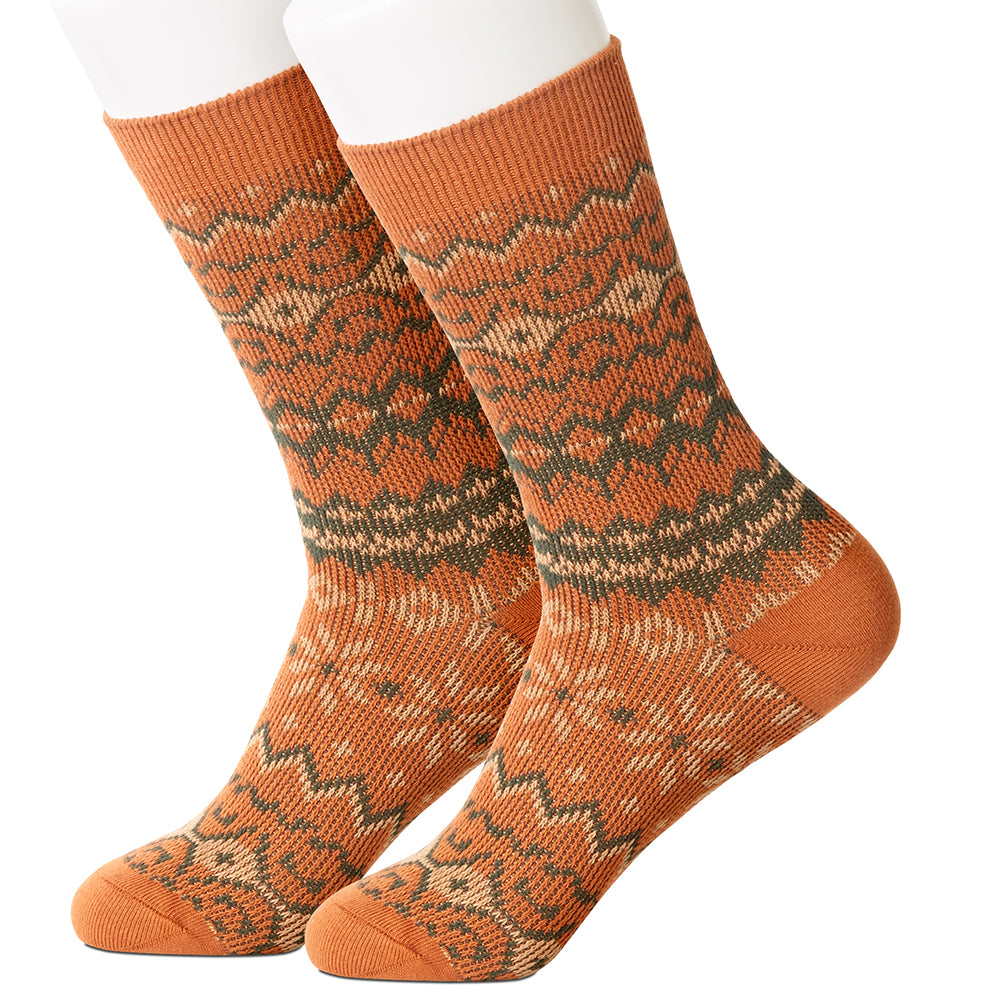 Green and tan bands of zigzags, floral icons and diamonds are woven into an Adobe brick background to create these oh-so-appealing warm-weather socks.