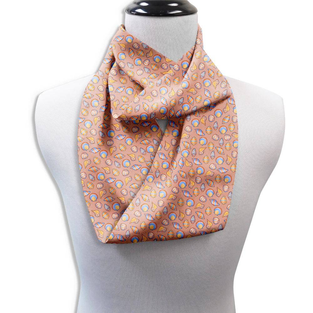 A magical collection of orange, blue and gold seashells tossed up on a shore of sandy-brown Italian silk twill is sure to add a special touch to your wardrobe.