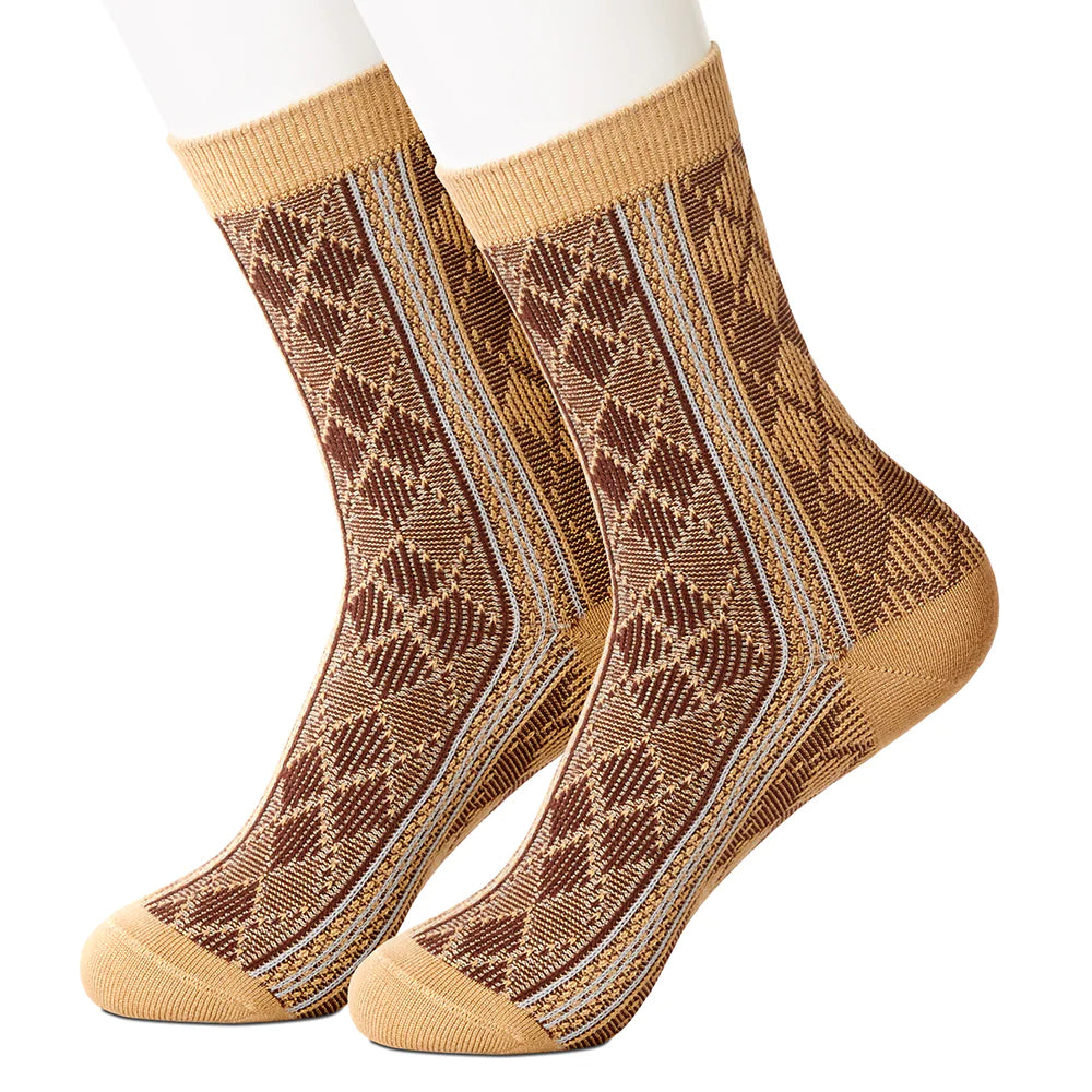 A clever pattern of diamonds within diamonds in shades of brown and ivory, are separated by light blue columns in these oh-so-appealing socks.