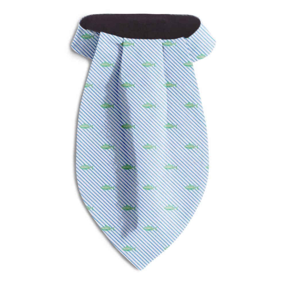 A school of fat green fish swim in an ocean of blue and white striped woven silk in this oh-so-appealing design.