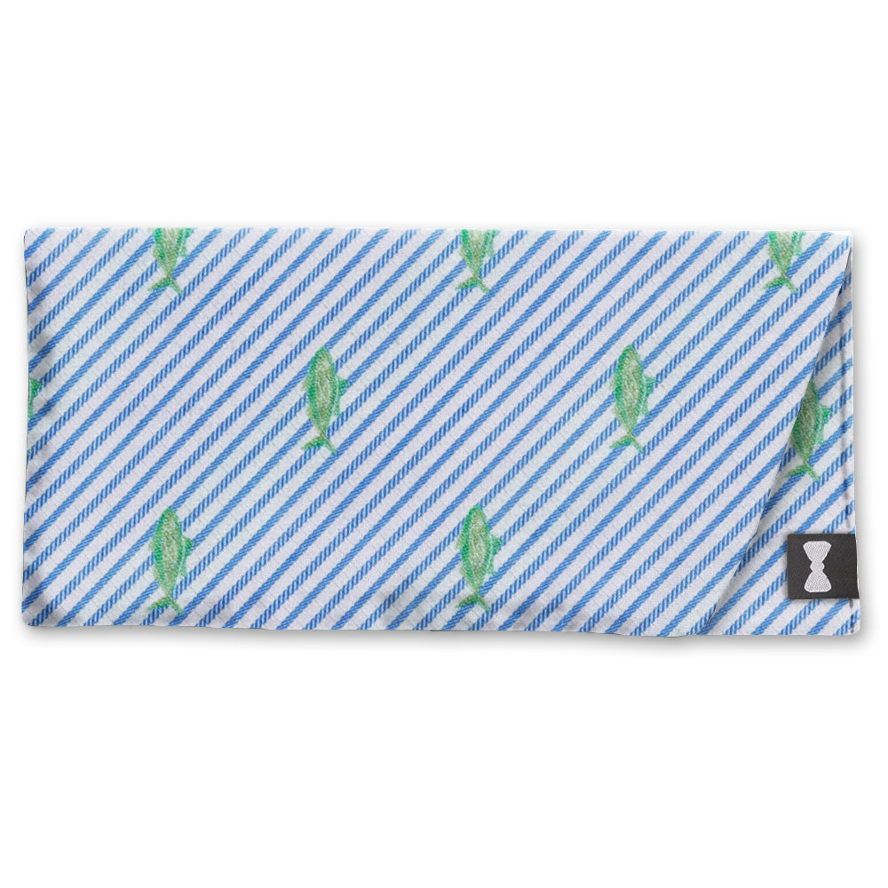 A school of fat green fish swim in an ocean of blue and white striped woven silk in this oh-so-appealing design.