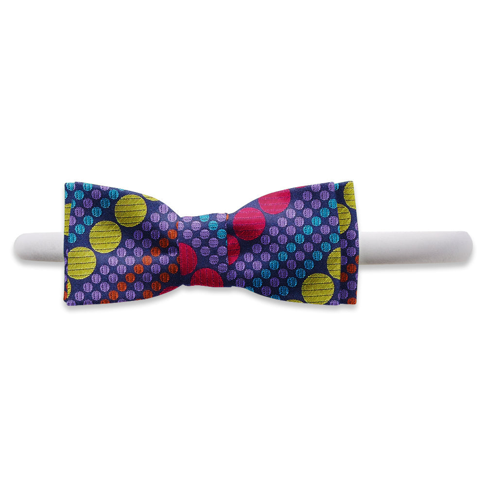 If you love polka dots, but are ready for a refreshing take on that plain little pip, here it is! Rows of textured discs in different sizes and colors, all woven in navy blue silk, create a unique and eye-catching design.