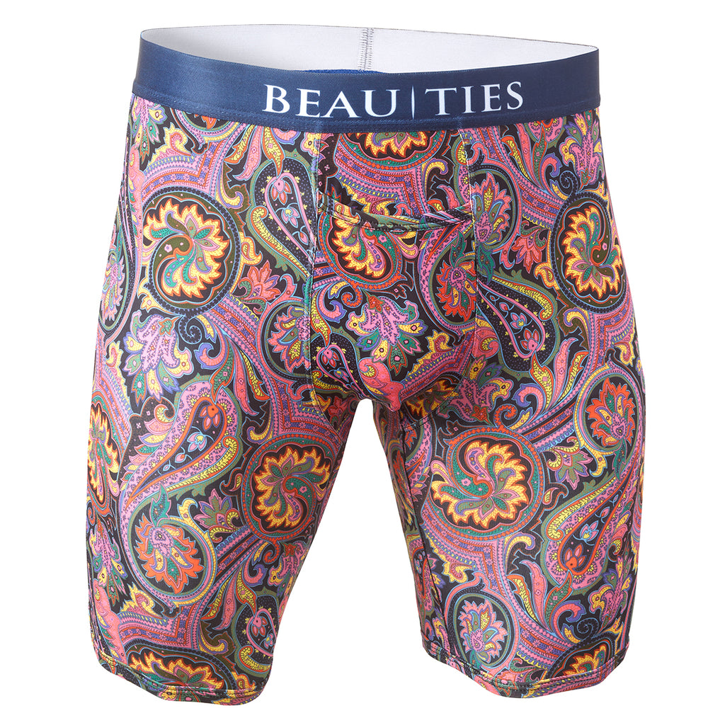 Designed for the active man, these boxers feature a vibrant paisley and floral design in shades of pink, gold and red on a deep black background. An uber-comfortable blend of 90% polyester and 10% spandex, we created them to provide you with support and durability, while keeping you cool and dry.