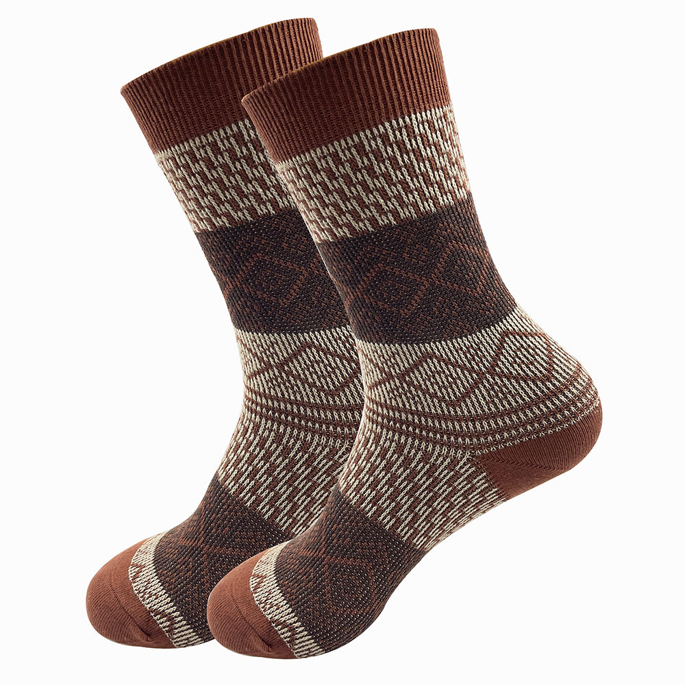 Treat your feet to these handsome socks with their bands of geometric designs in shades of brown.