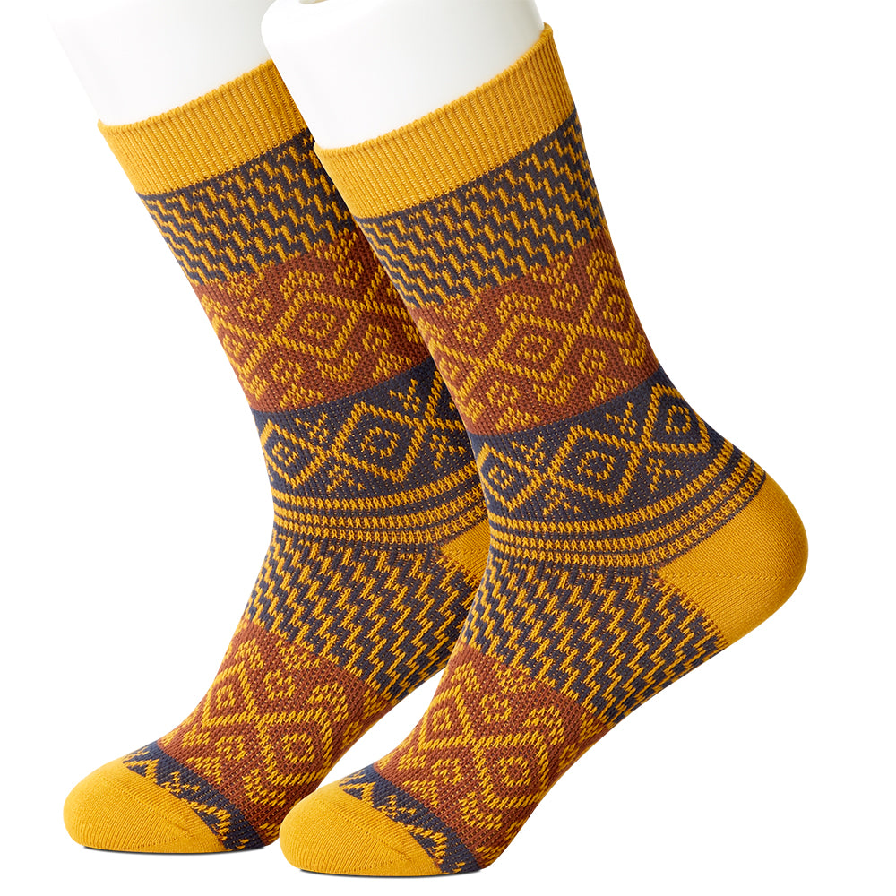 Treat your feet to these handsome socks with their bands of geometric designs in shades of gold, woven in black and brown.