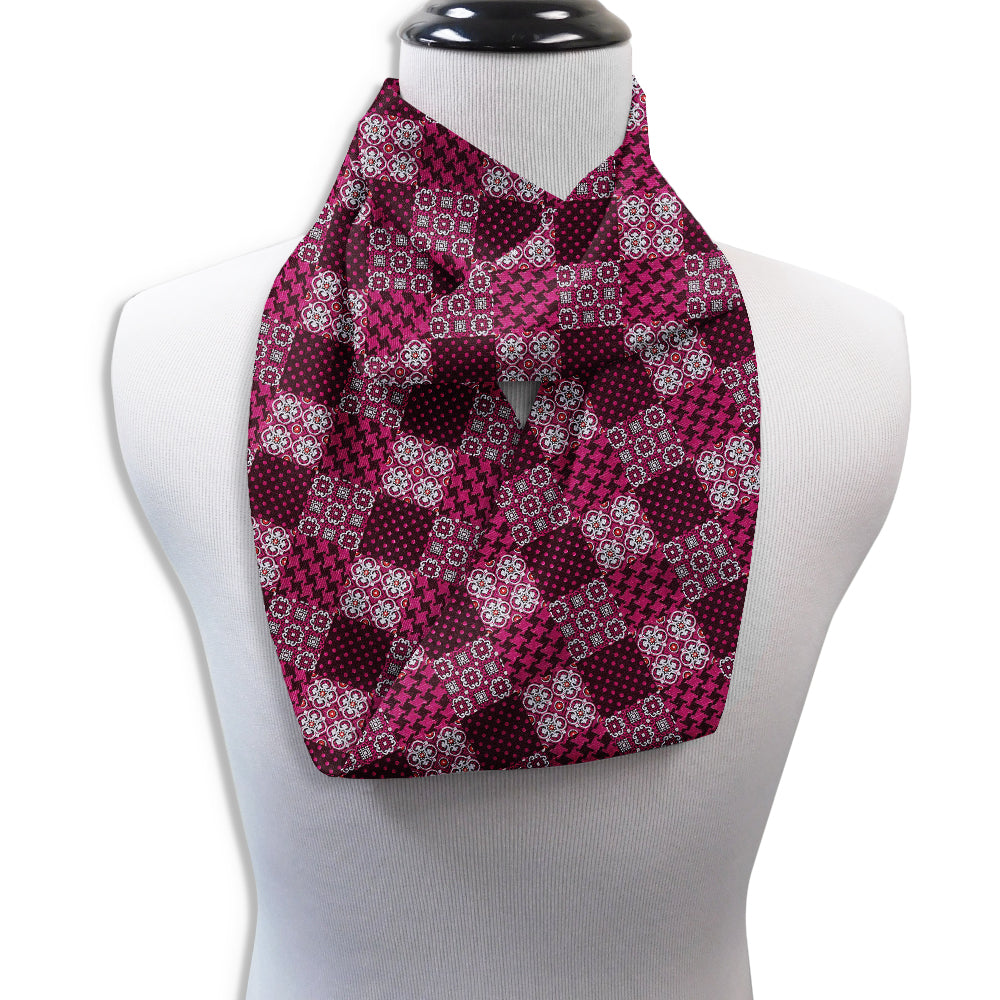 We think you'll be intrigued by this patchwork of squares within squares - featuring polka dots, houndstooth and two floral motifs - all in warm shades of pink with silver highlights woven in black silk.