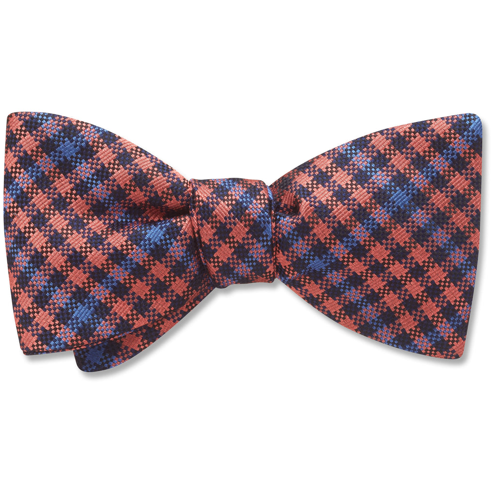 Almost houndstooth shapes are woven into this unique plaid pattern with crisscrossing bars of dark pink and light blue on navy silk.Its going to look great with your tweed jacket.