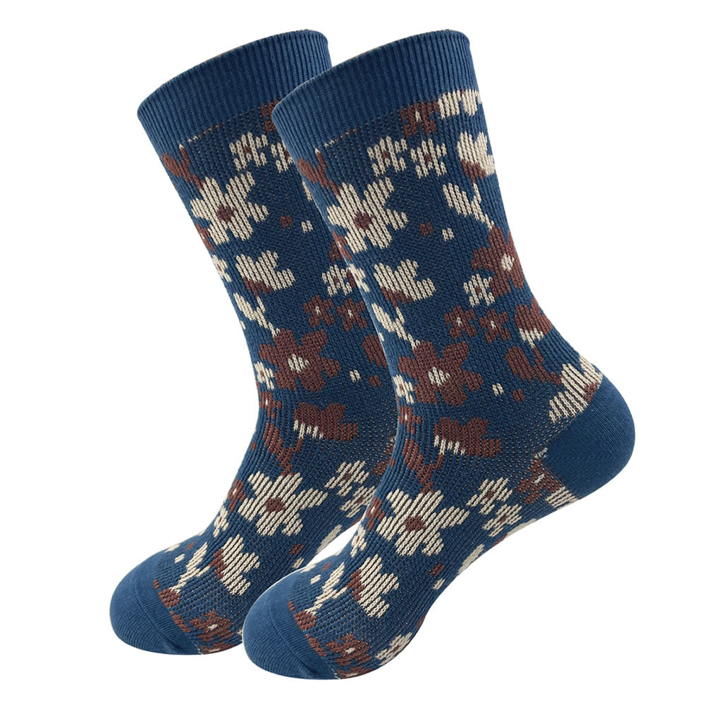 Garlands of red and white blossoms mingle as they climb from toe to top on these dusky blue socks.