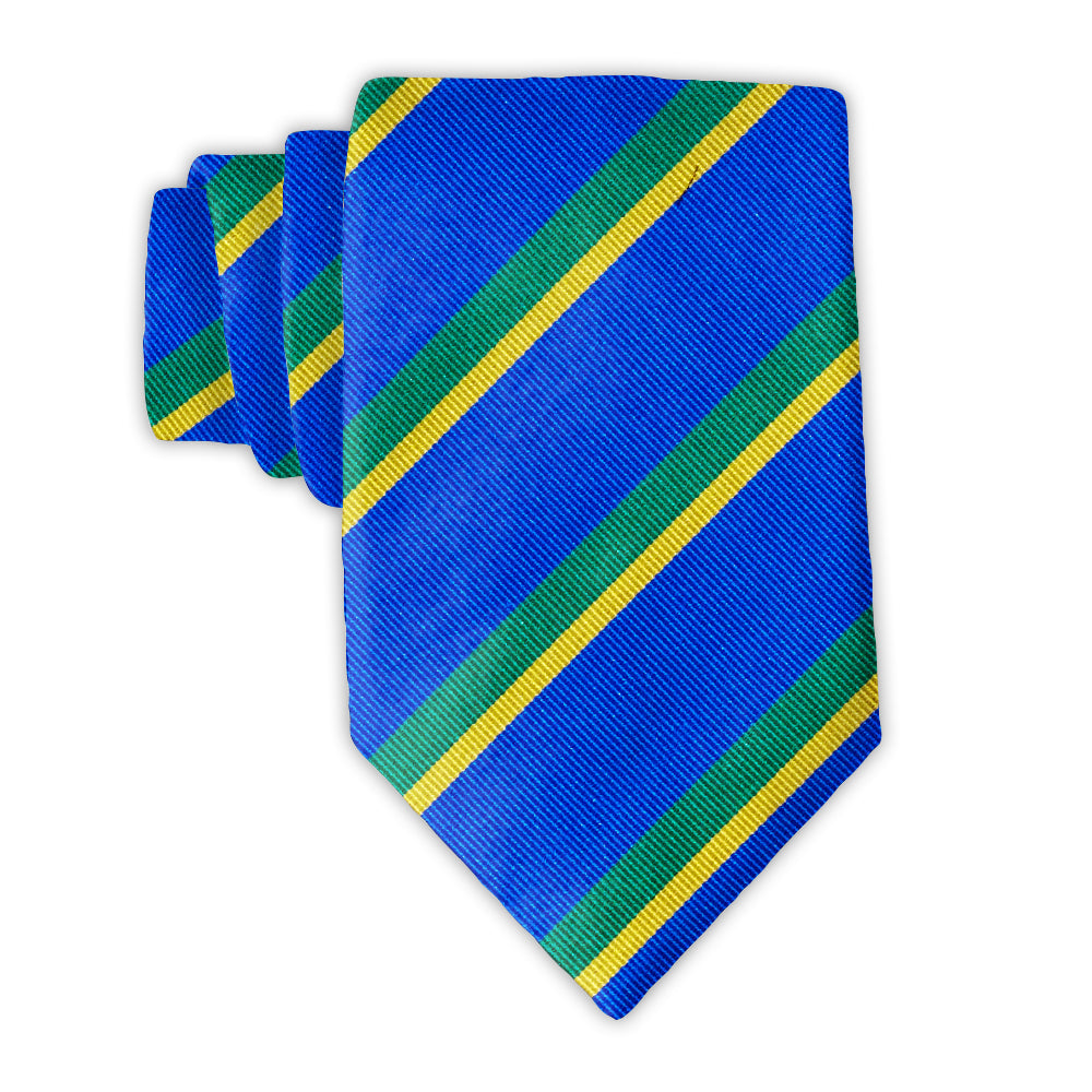 Handsomely ribbed woven silk features broad bands of bright blue interspersed with stripes of green and gold.