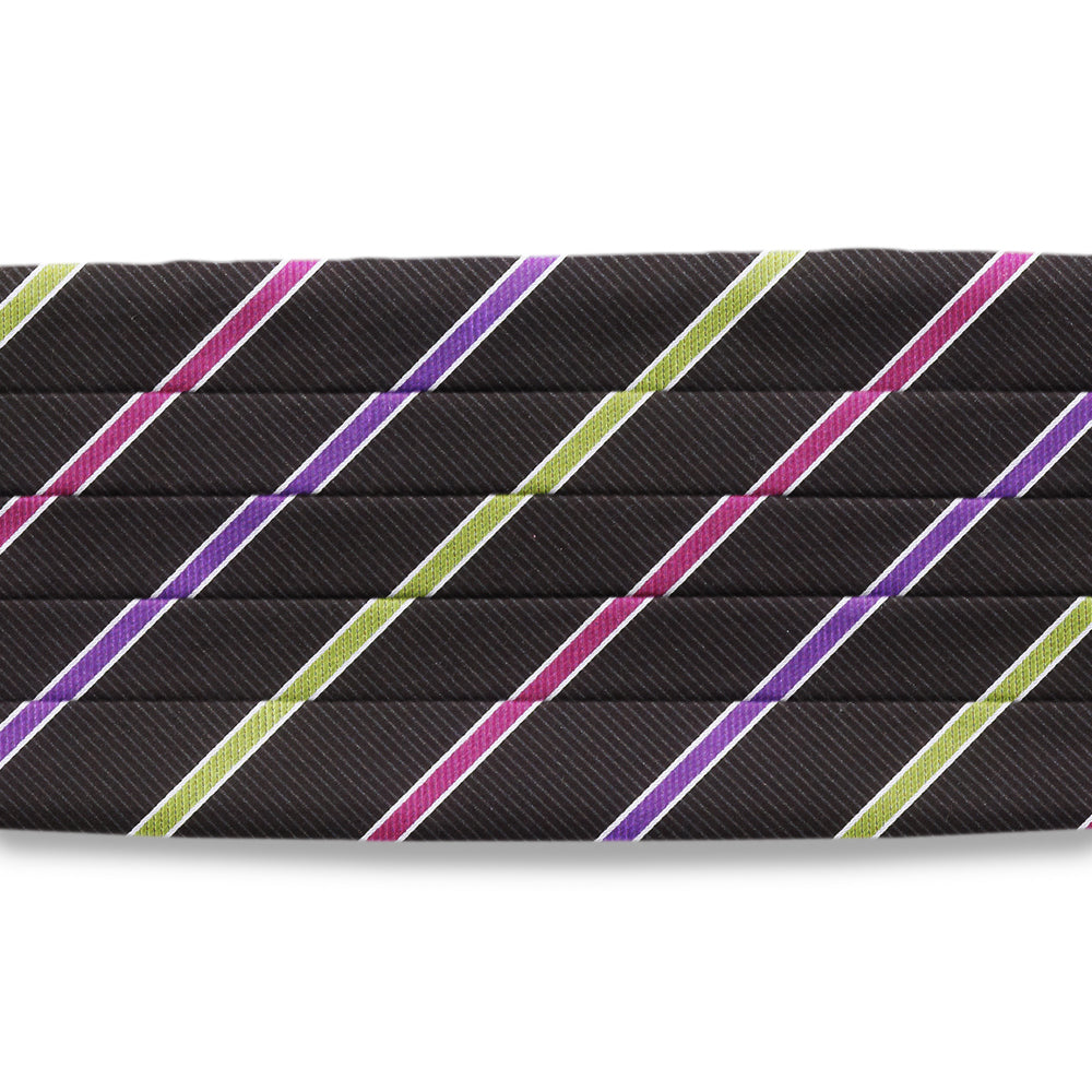 Slim ribbons of purple, magenta and green, each trimmed in white, are woven between broad bands of handsomely ribbed black woven silk. A distinguished option with a little attitude.