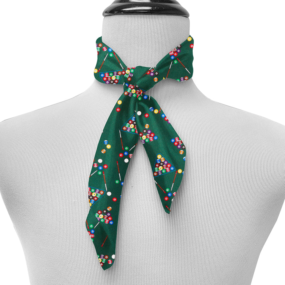 Indulge your inner pool shark with this dark green silk twill and its clever design of combinations of pool cues, balls and racks.