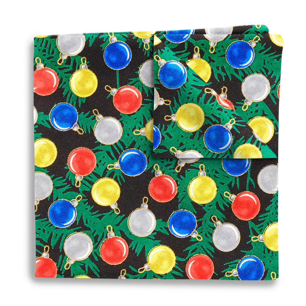Evergreen boughs and a cheerful collection of red, gold, silver and blue tree ornaments looking for a home meet each other here on black silk twill. A perfect match.