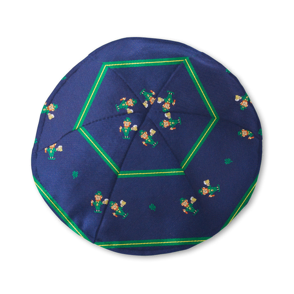 Happy leprechauns, replete with full pints of ale, stand between lucky four-leaf clovers, all woven in broad bands of navy blue silk that are bordered with slim trios of green and yellow. Sláinte!
