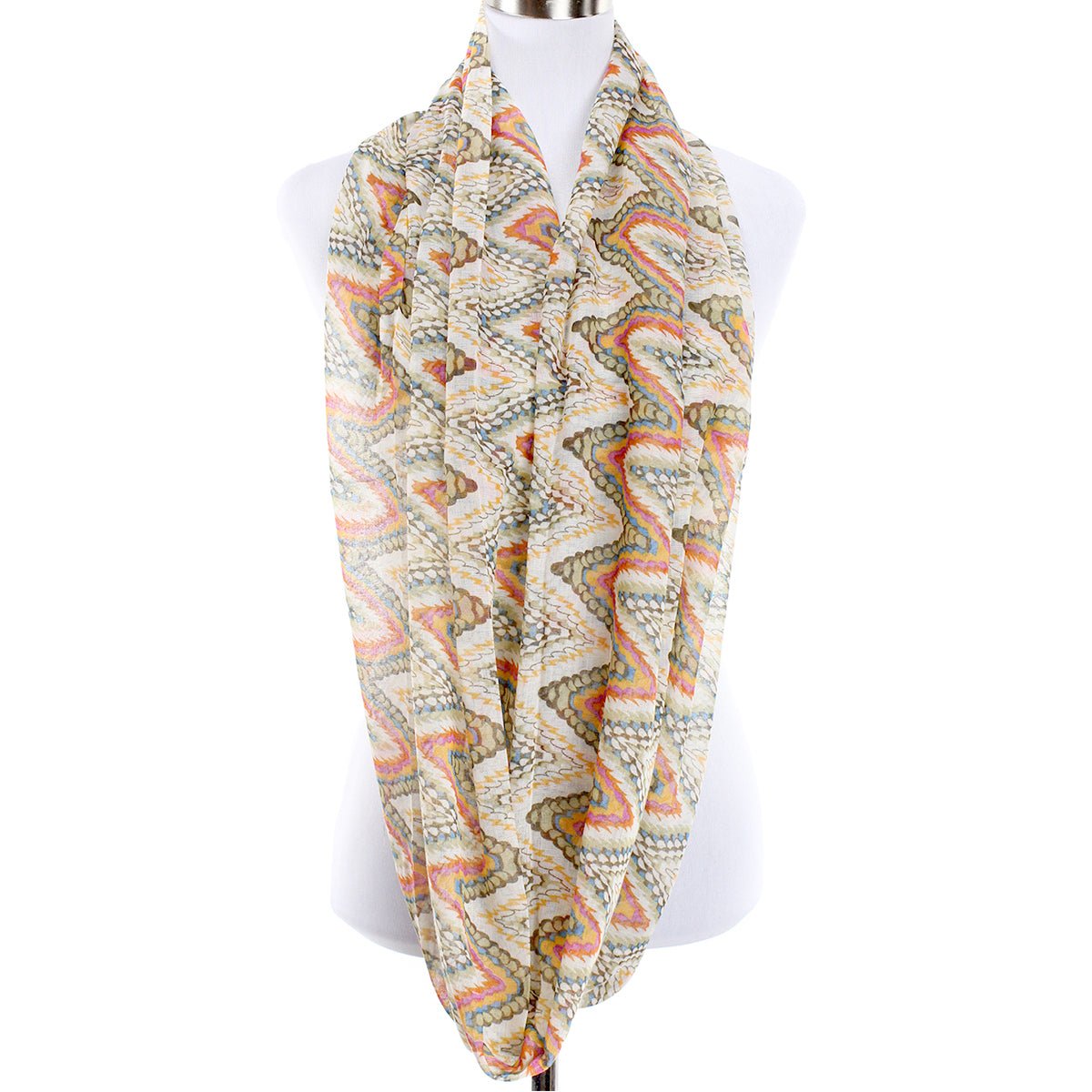 This perfect-for-summer-wear infinity scarf is woven in a feather-weight viscose rayon – a silky smooth fabric created from wood pulp – and measures approximately 19.5” wide with a circumference of 72”.