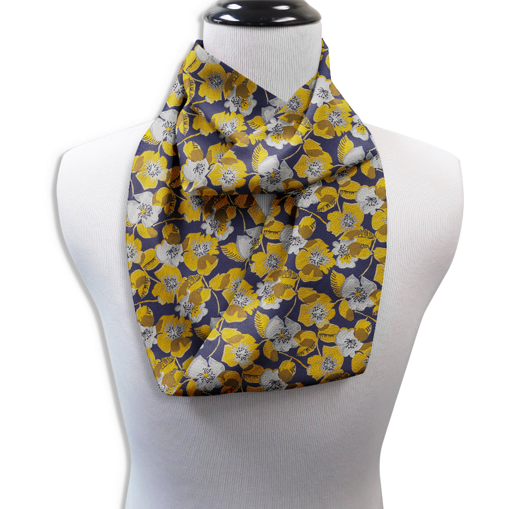 Navy blue woven silk abounds with delicately detailed yellow and silver blooms in this lovely design.