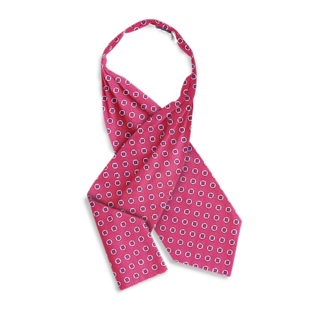 The Florence Pink patterned free-fold cravat features three stitched center pleats that allow luxurious drape in front without fabric bulk at the nape of your neck. It is completely reversible and sized for a perfect fit. May require a stick-pin.